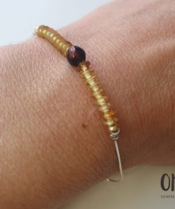 - Pulsera con pequeñas donas de ámbar amarillo coronadas por una esfera de ámbar rojo al centro.